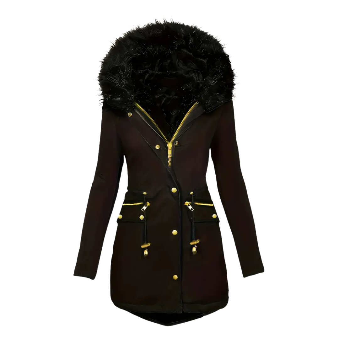 - Odpinany kaptur wykończony eleganckim sztucznym futrem