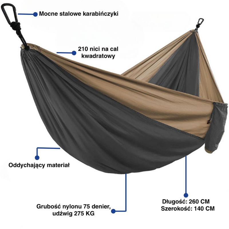 - Lekki i trwały: Wykonany z wysokiej jakości tkaniny spadochronowej, hamak jest jednocześnie lekki, mocny i odporny na zużycie.